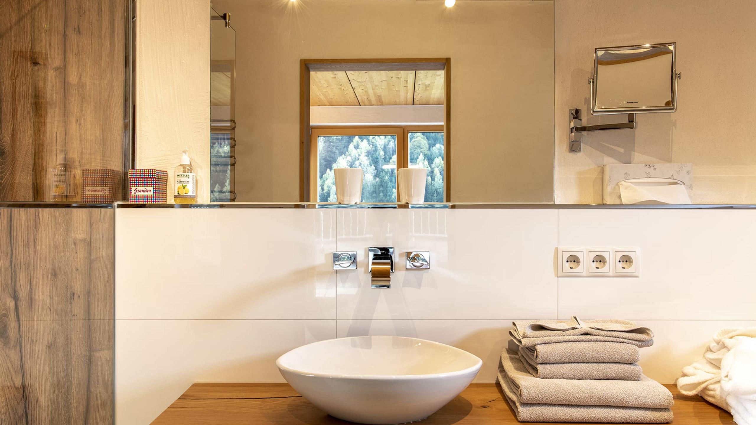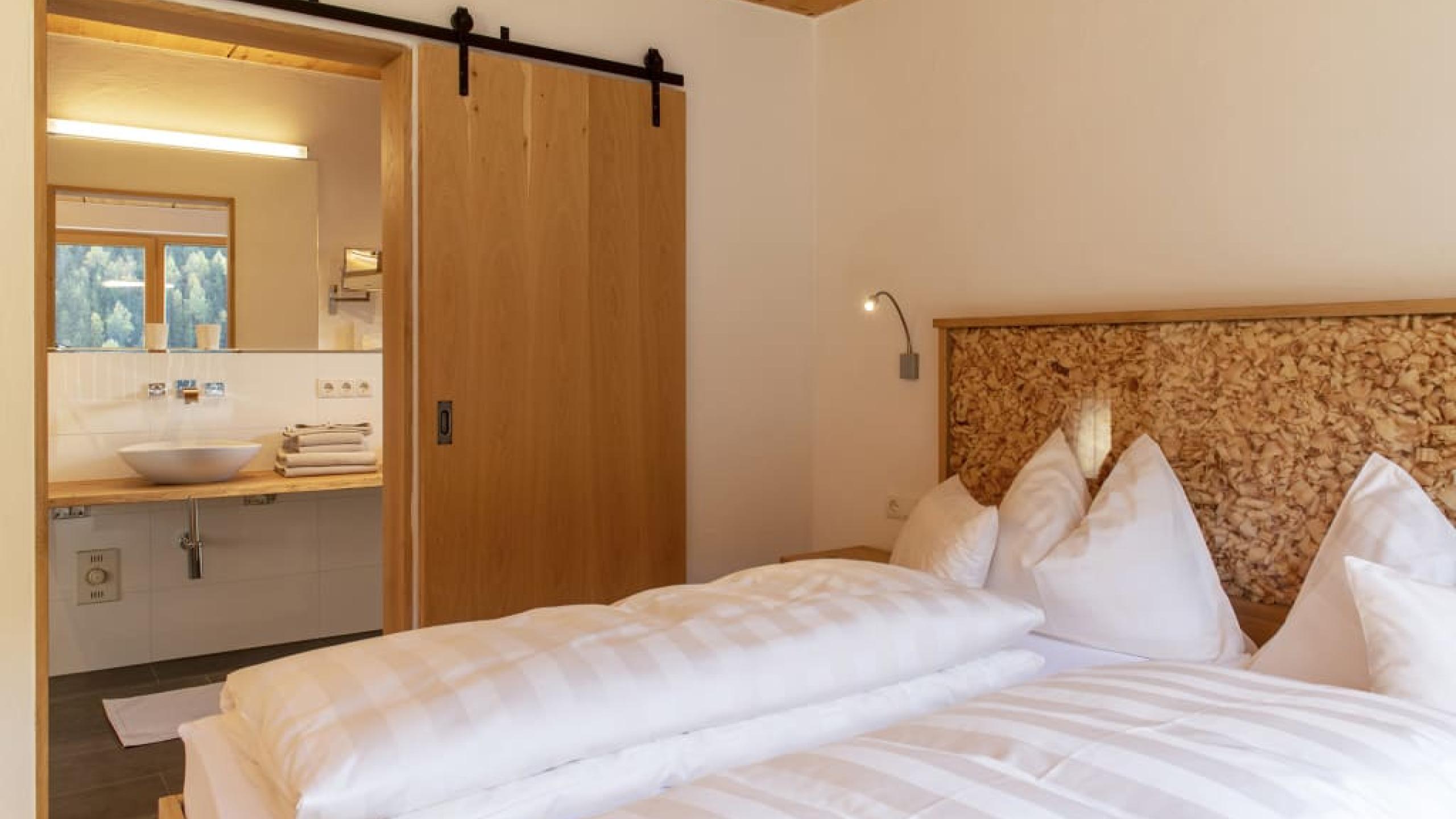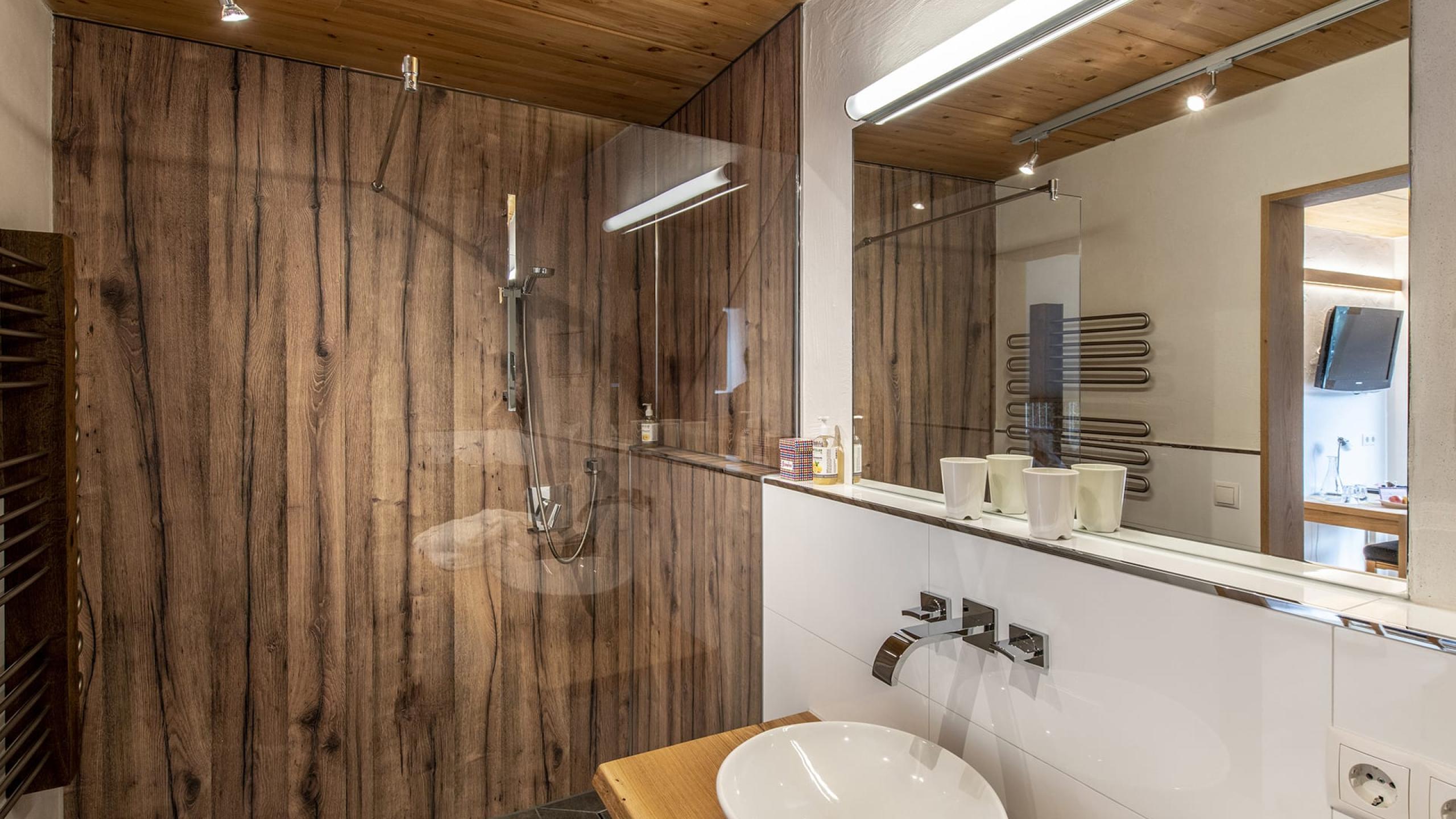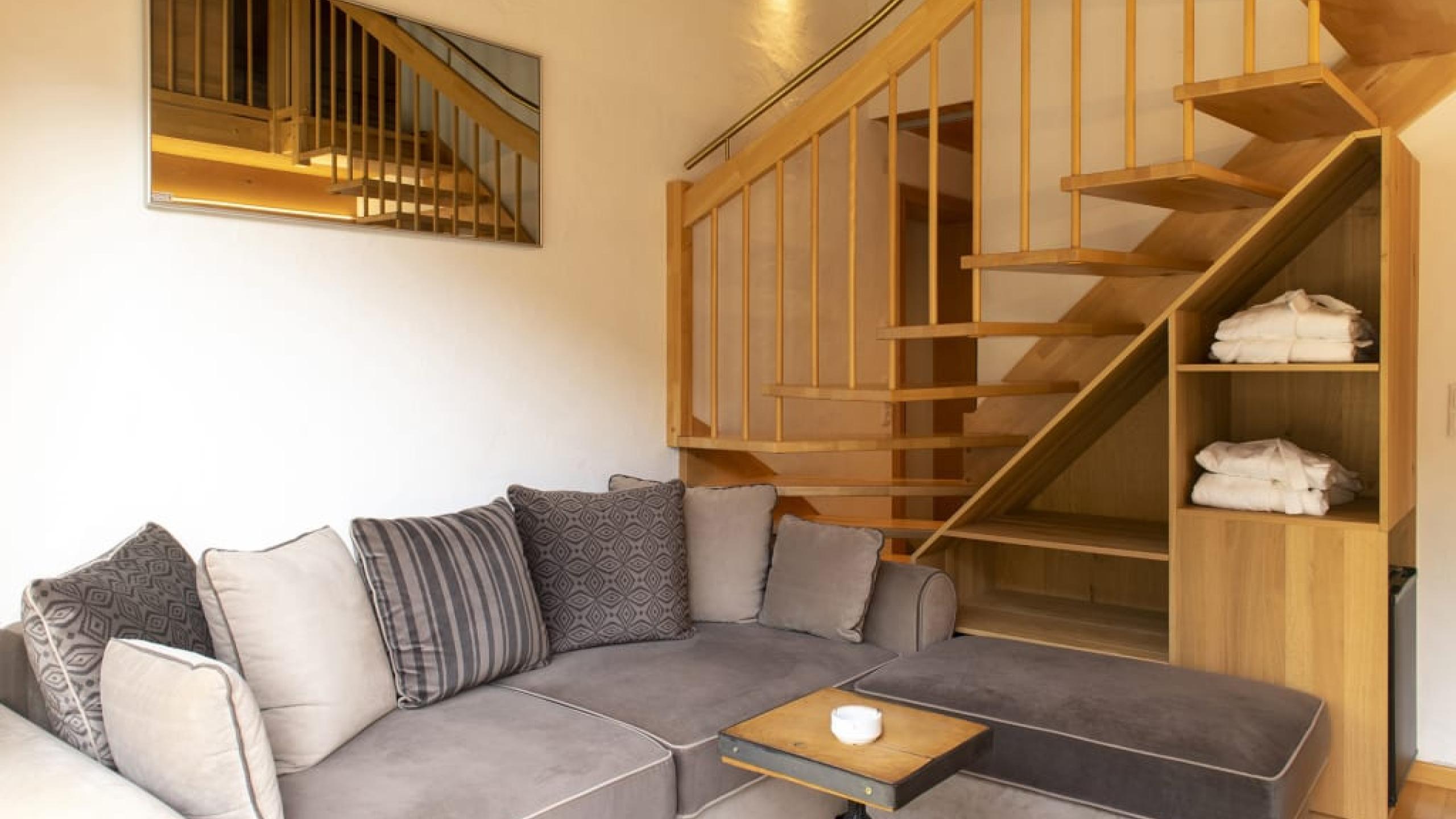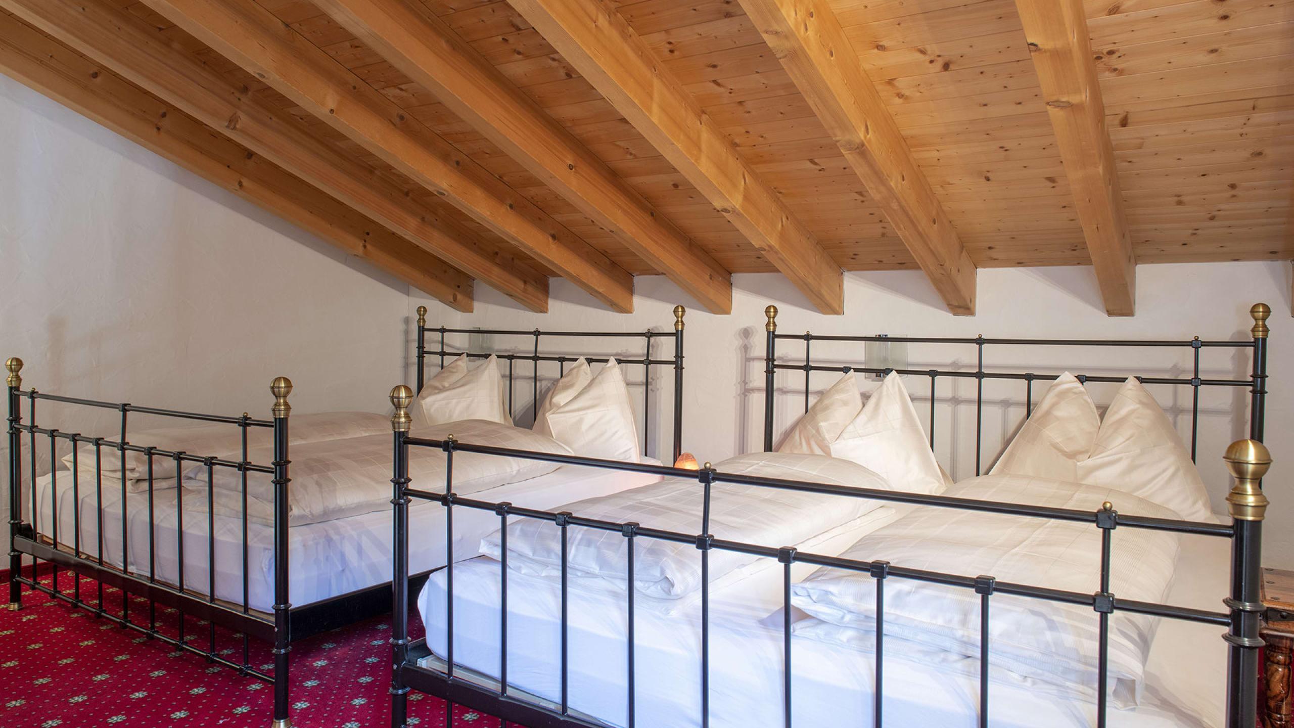 This very spacious suite extends over two floors and has two bathrooms, each with a shower and toilet. On the ground floor, the sleeping and living areas can be separated, have parquet floors and each have their own TV. The mezzanine has two double beds and also its own TV. A large cozy couch is available in the common living area. The spacious south-facing balcony offers a wonderful view of the mountains. A minibar is available upon request.