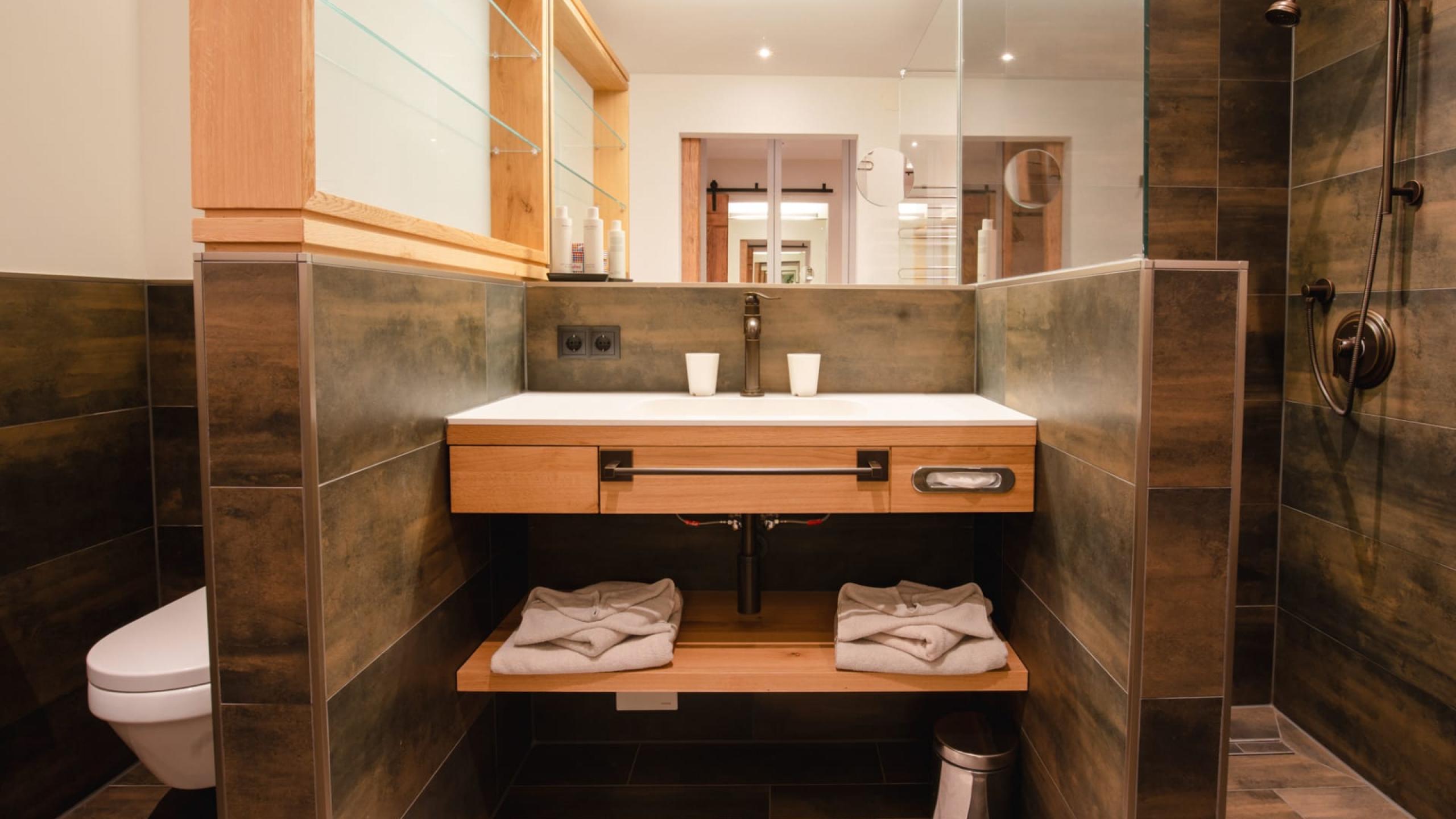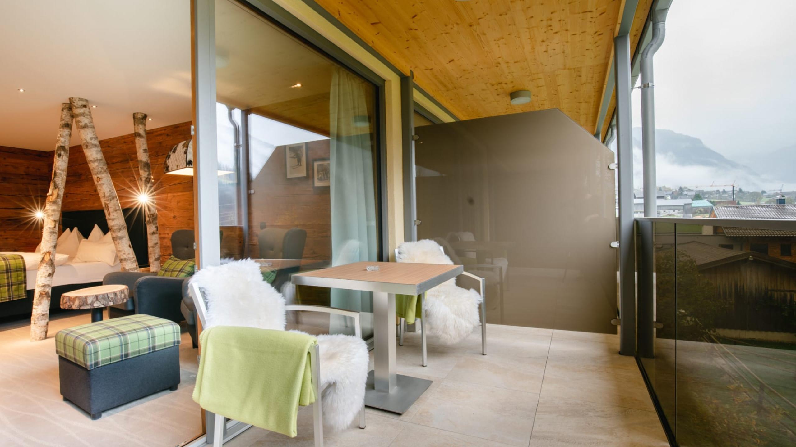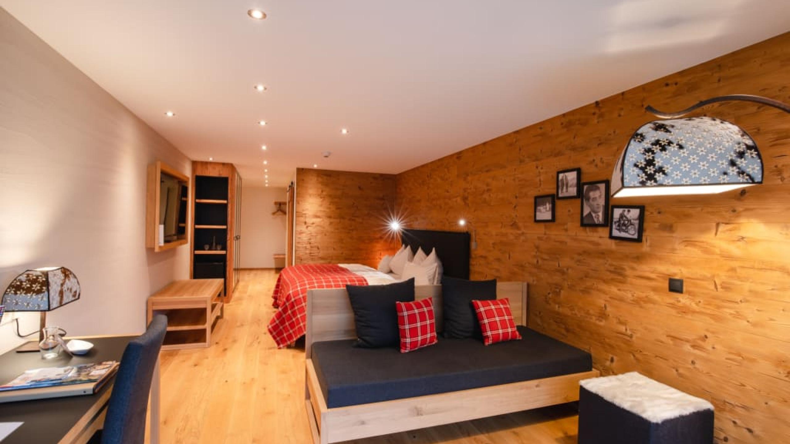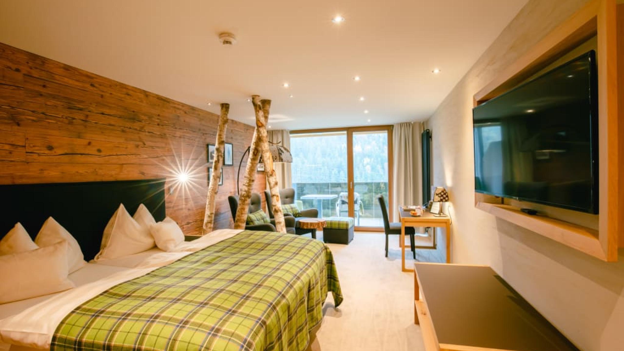 The stylish double room scores with a special clay plaster for a particularly pleasant living environment and a spacious bathroom. Some of the rooms have oak parquet floors and some have carpet. High-quality, separable box spring beds with the finest damask bed linen are a guarantee for restful nights. It also has a south-facing balcony with a view of the mountains and the hotel garden. A minibar is available upon request.