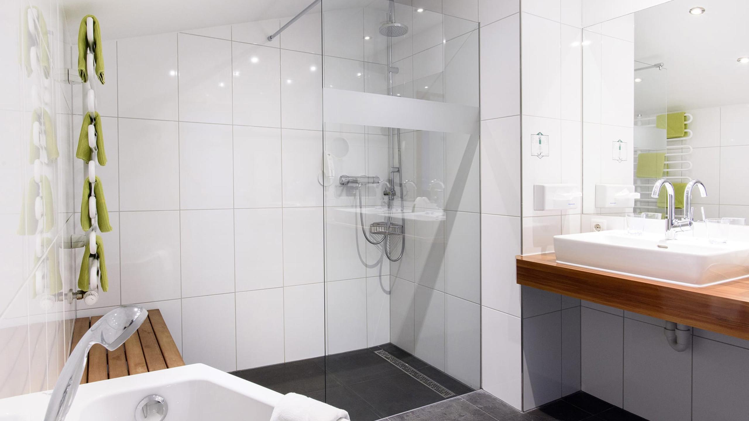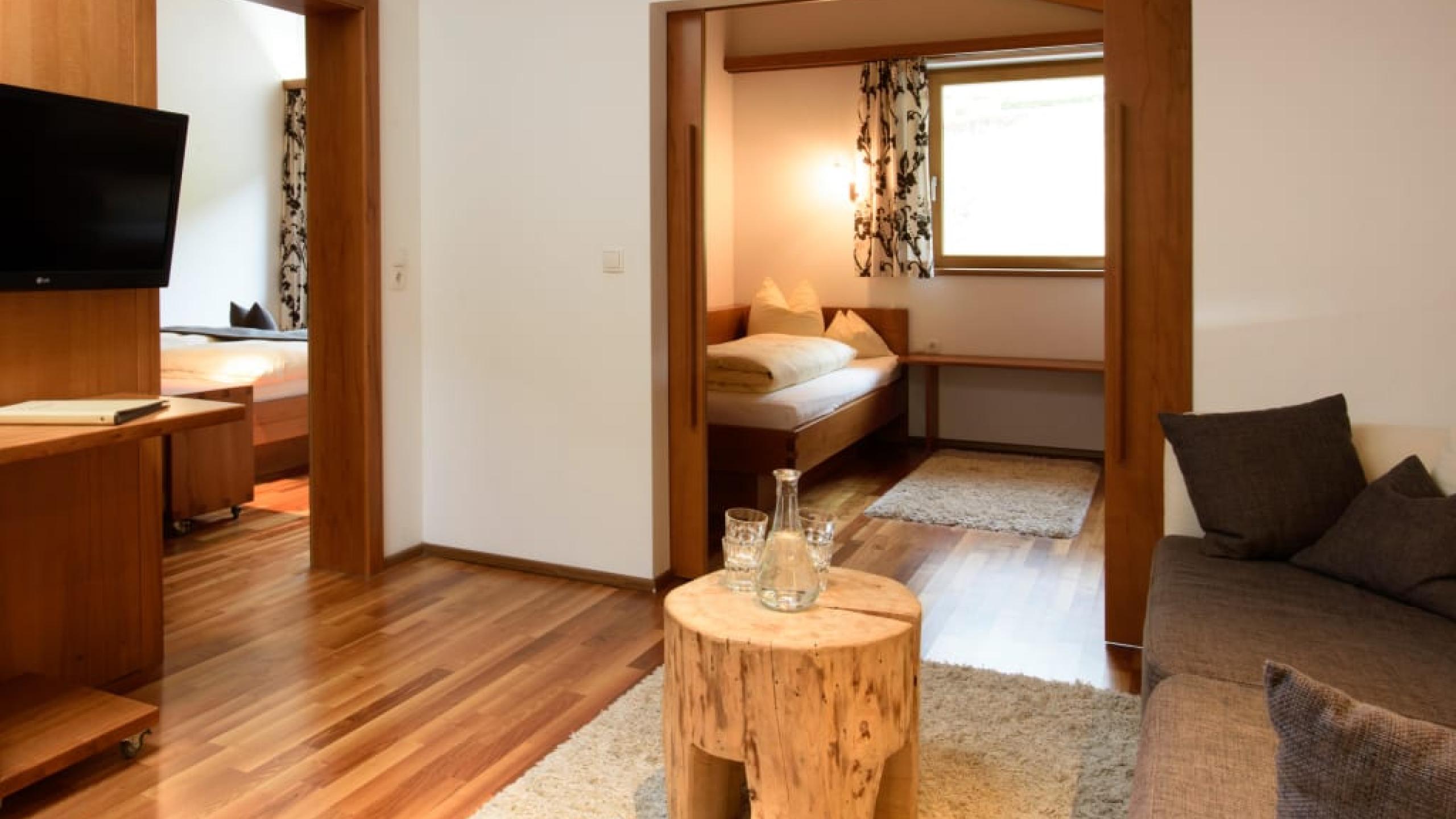 Diese komfortable Suite verfügt über zwei separate Schlafräume, einer mit Doppelbett, einer mit zwei separaten Betten. Die Verbindung bildet der gemeinsame Wohnbreich mit TV-Gerät und gemütlicher Couch. Alle Räume verfügen über einen Vollholzparkettboden. Im Badezimmer befinden sich eine Badewenne sowie eine Dusche und das WC ist separat. Die nordseitige Suite (Straßenseite) hat keinen Balkon. Eine Minibar wird auf Wunsch bereitgestellt.