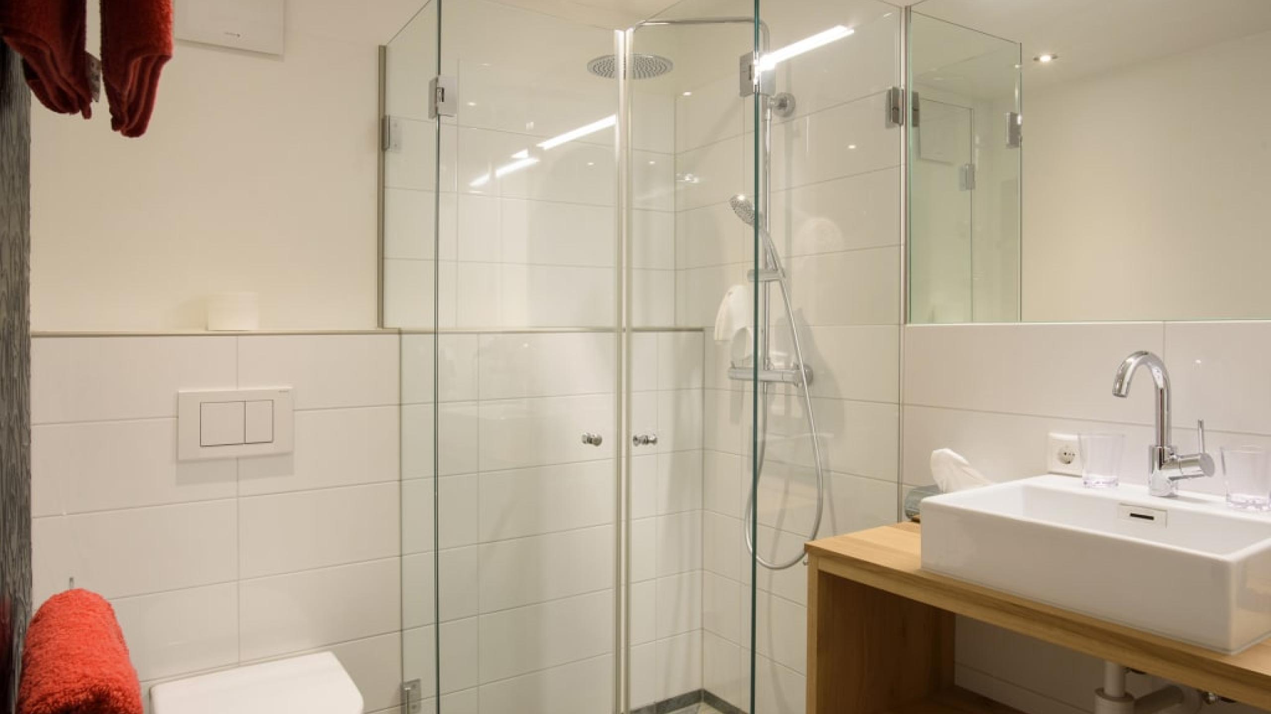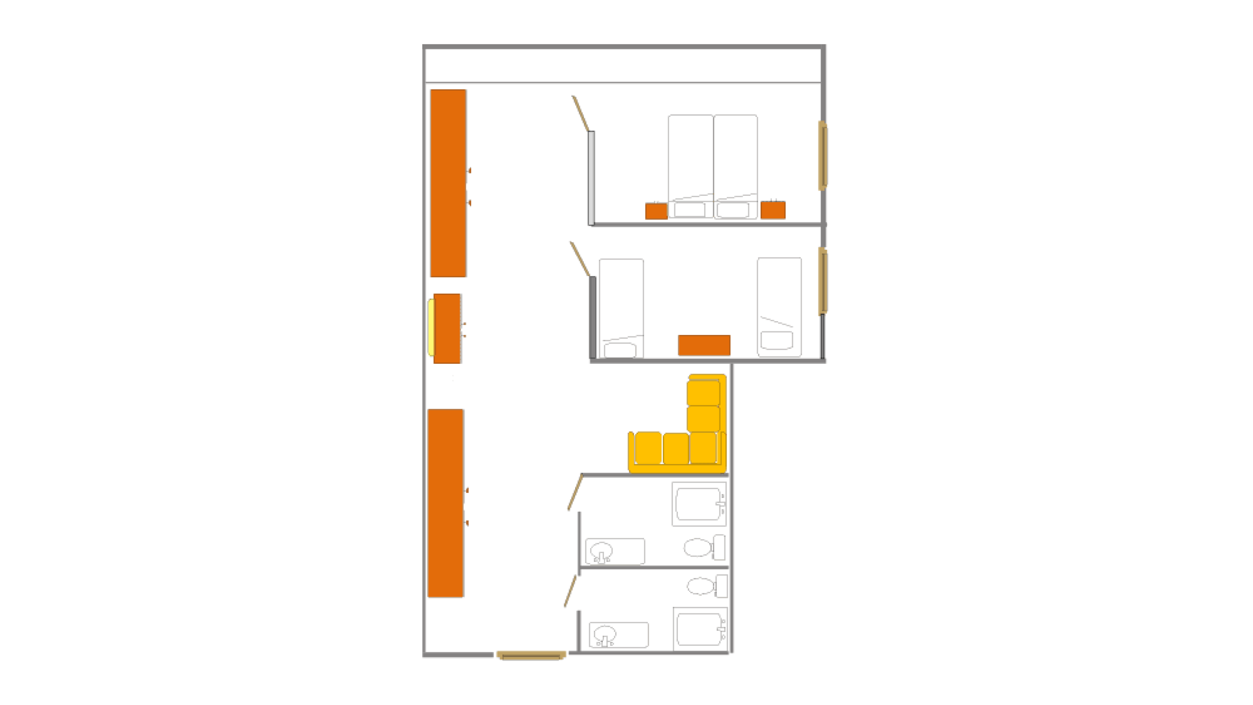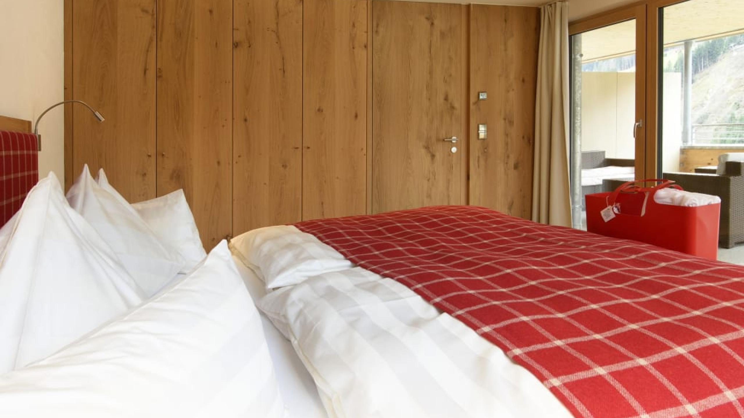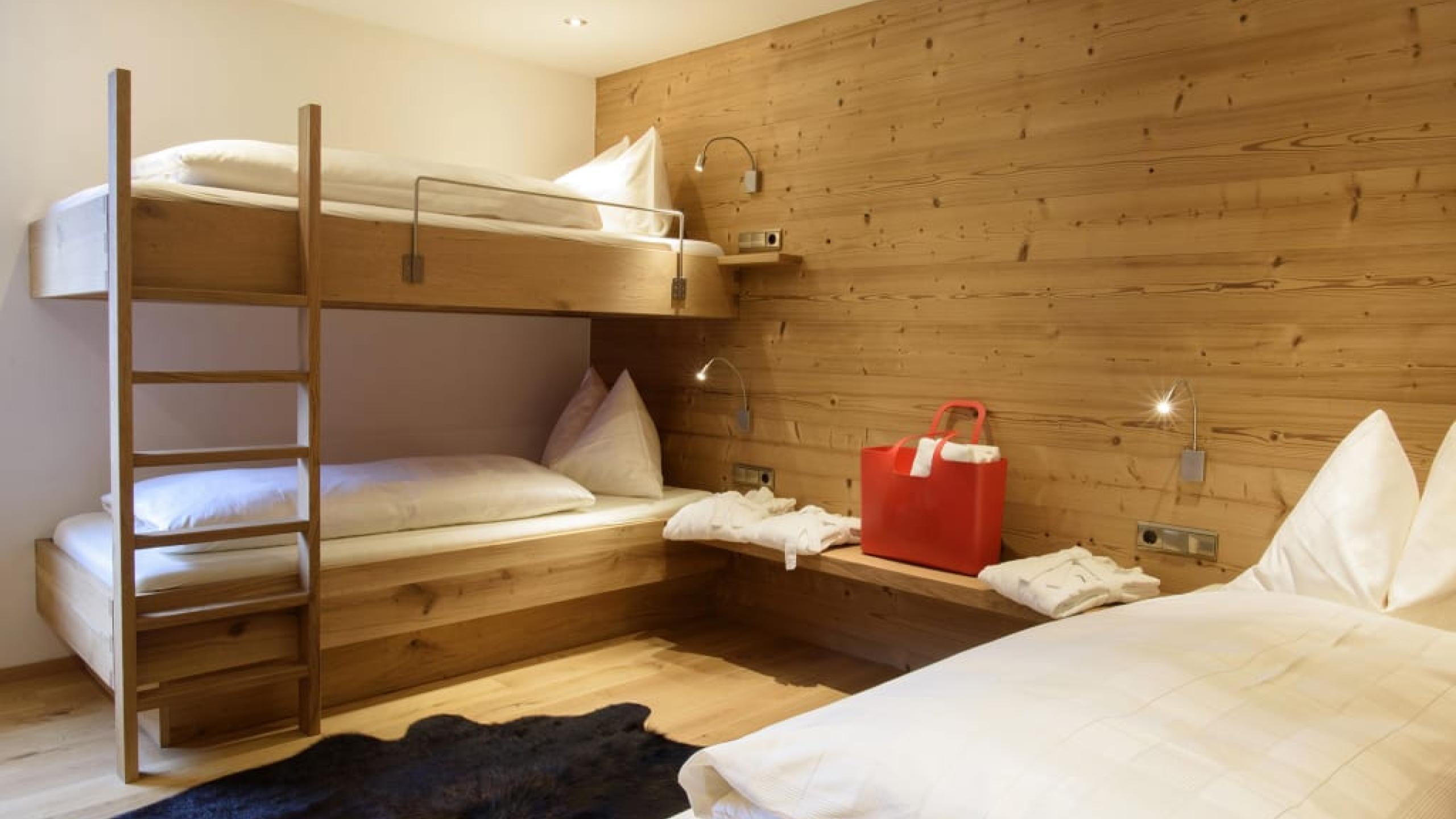 Diese Suite verfügt über eine 10 m² große, überdachte Terrasse und zwei separate Schlafräume. Einer verfügt über ein Doppelbett, im anderen befinden sich ein Etagenbett und ein Einzelbett. Die gemütliche Kuschelcouch lädt zum Plaudern und Relaxen ein. Jeder Raum hat ein eigenes TV-Gerät. Diese Suite verfügt über zwei separate Badezimmer mit jeweils Dusche und WC, ideal für mehr Privatsphäre. Alle Räume sind mit Eichenparkettboden ausgestattet. Eine Minibar wird auf Wunsch bereitgestellt.